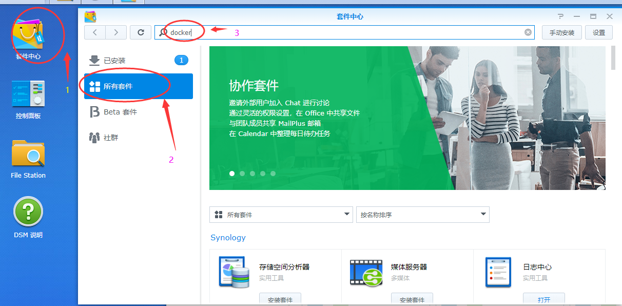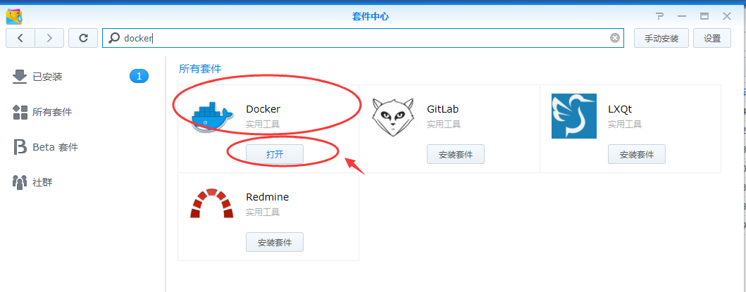 1、首先,我们要打开套件中心,安装docker,如图,如果已经安装的,直接看第3步