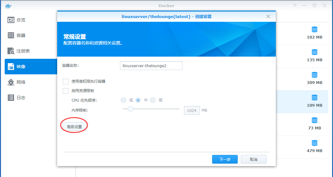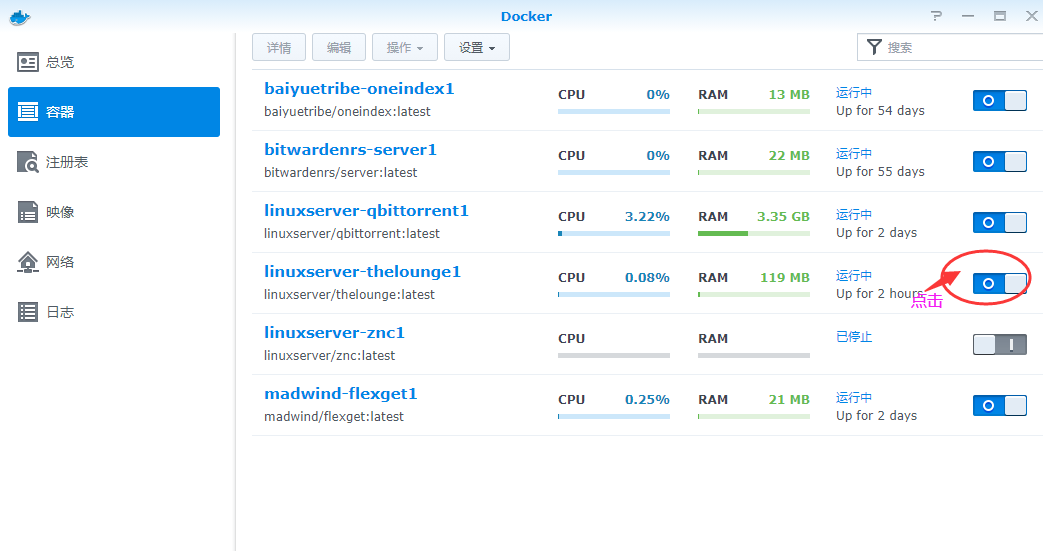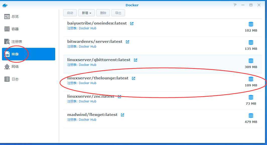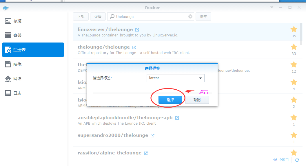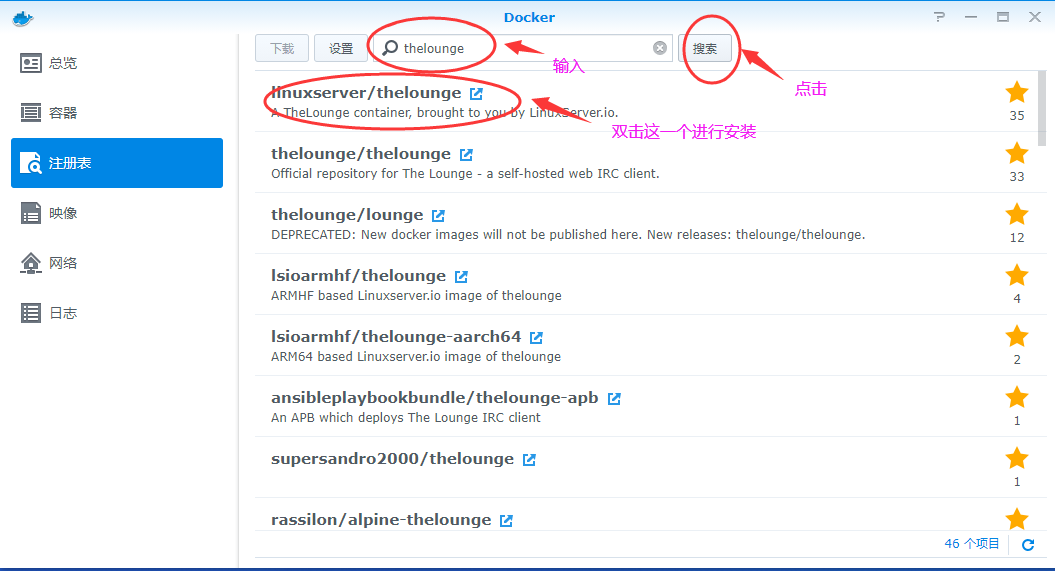 然后我们接着打开docker程序,点击影响,双击刚才下好的thelounge,点击安装