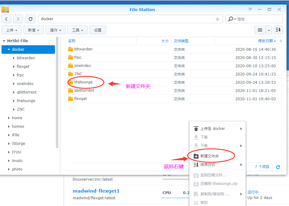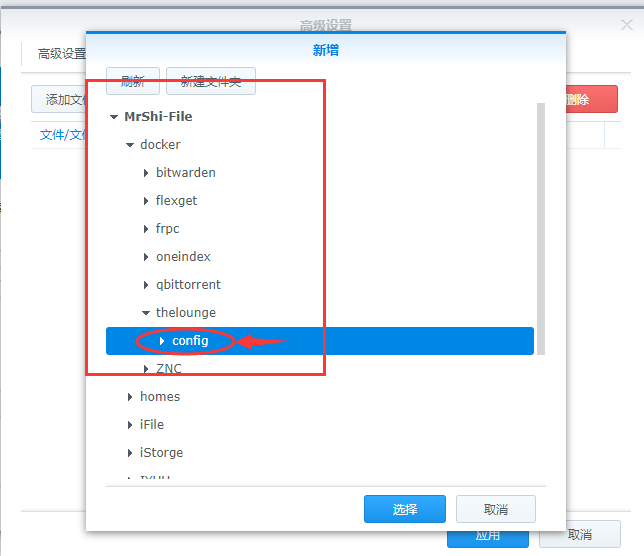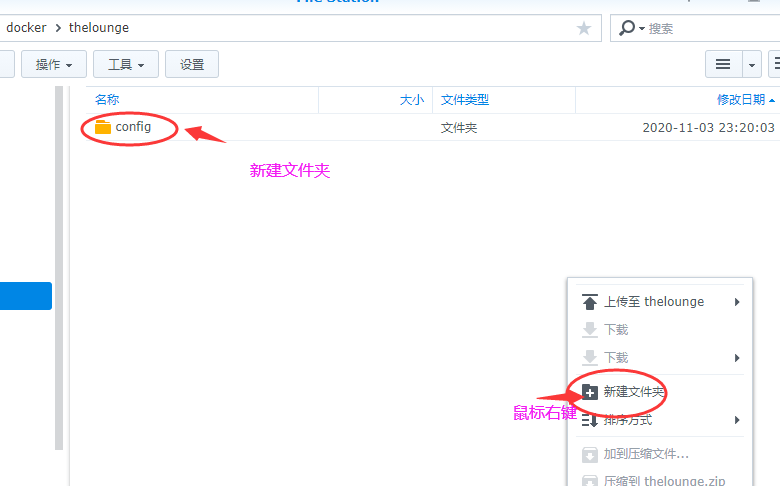我们先新建一个文件夹,我们先打开file station,然后进入docker文件夹,新建一个名为thelounge的文件夹,然后再点击进入thelounge文件夹,新建一个config的文件夹