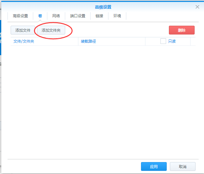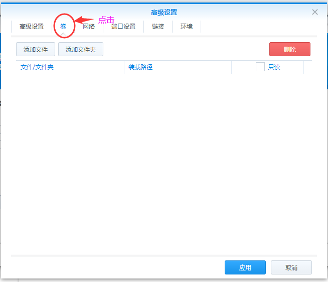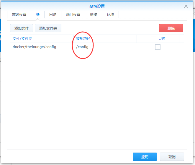 接着我们点击高级设置,然后点击卷,设置文件映射,文件路径就是我们刚才新建的文件夹,装载路径填写/config
