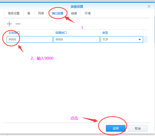 文件映射之后,我们设置下端口,容器端口不用动,本地端口设置成9000,然后点击应用就可以了,如果需要外网访问,我们还需要路由器设置端口转发,