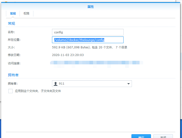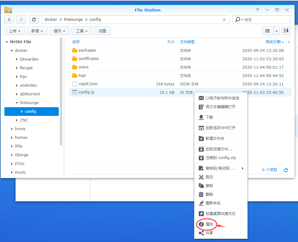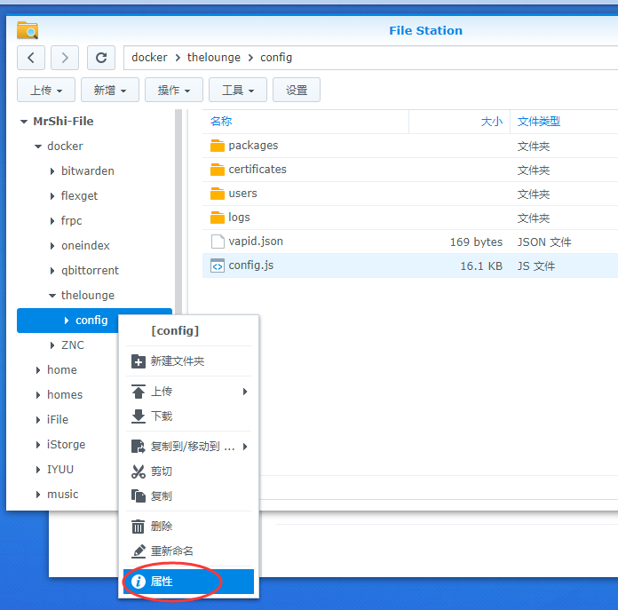 我们进入/docker/thelounge/config文件夹,右键点击文件config.js的属性,修改权限,我们增加写入权限
