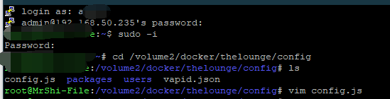 然后cd /volume2/docker/thelounge/config(这个路径,就是自己刚才复制的路径)