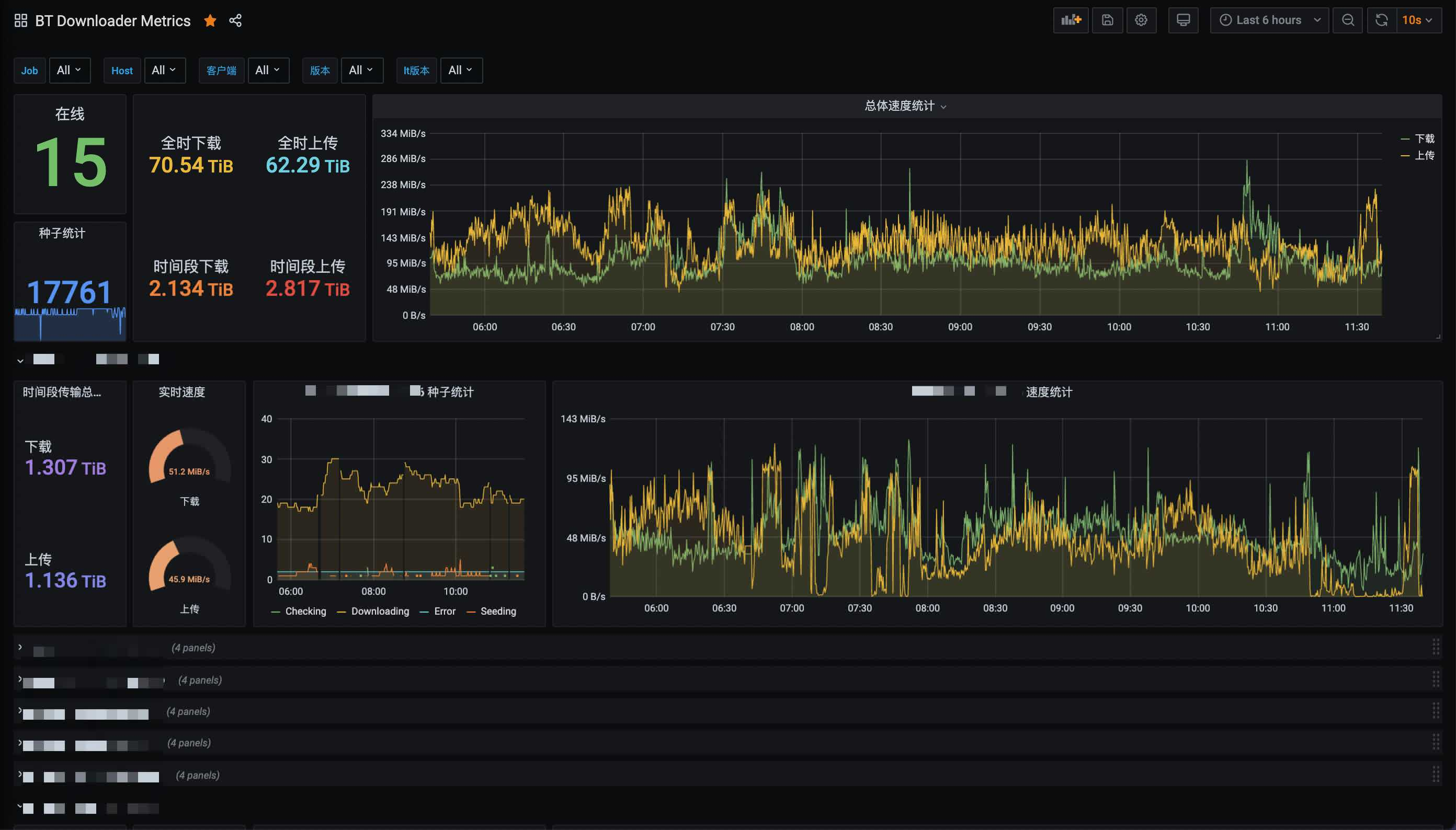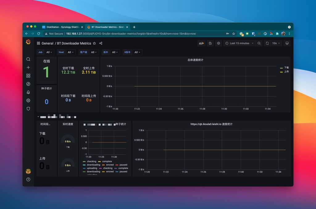 本文将教你如何用Grafana和Promethus搭配订制的exporter在群晖搭建一个用于统计qBittorrent/Deluge/Transmission流量的面板,最终效果如下: