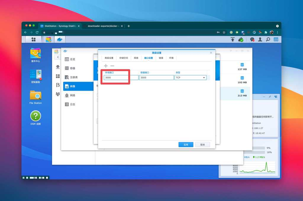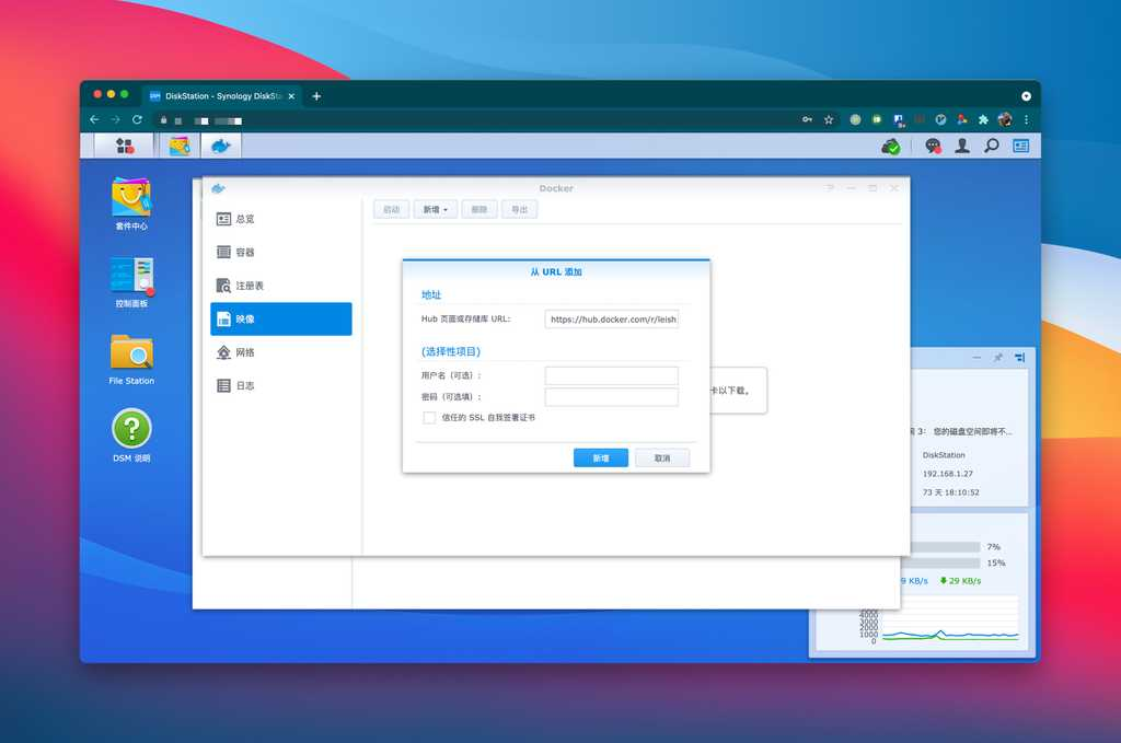 在群晖Docker的映像页面,选择新增一个映像,URL输入https://hub.docker.com/r/leishi1313/downloader-exporter