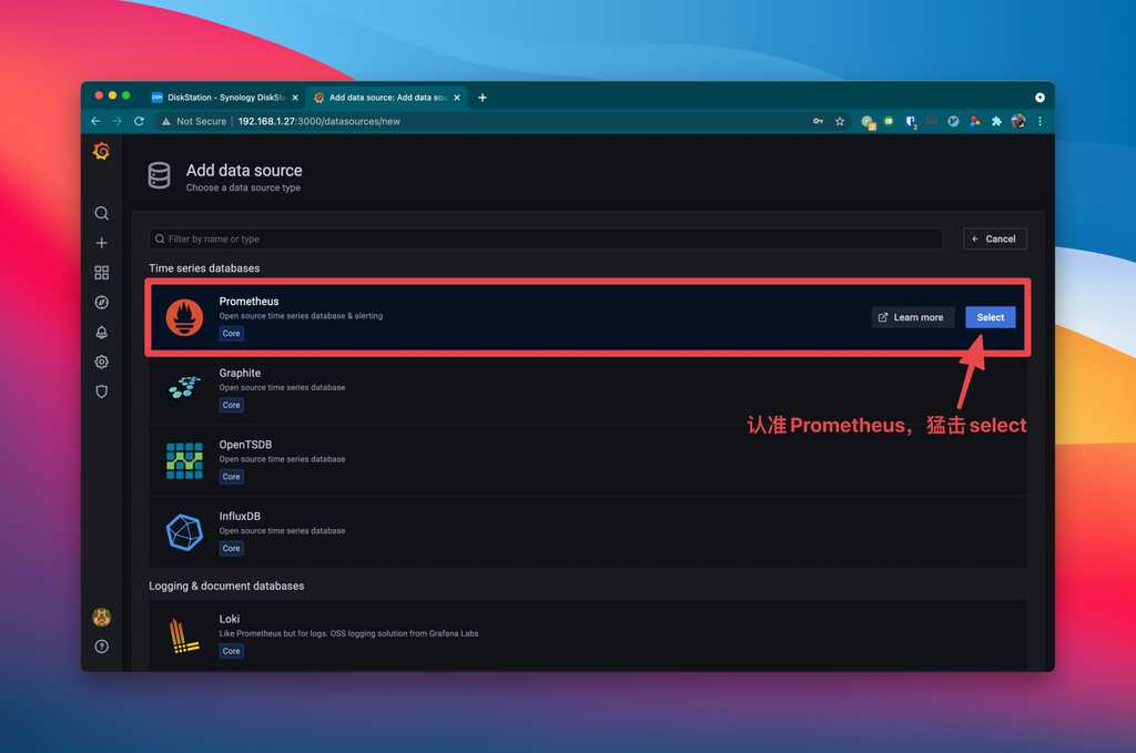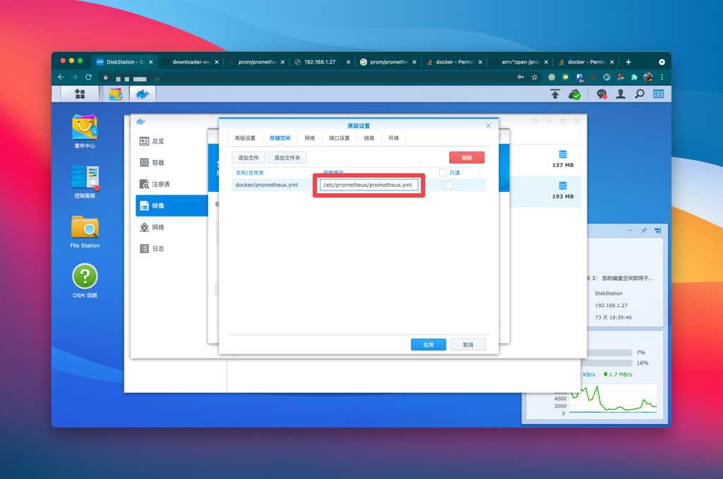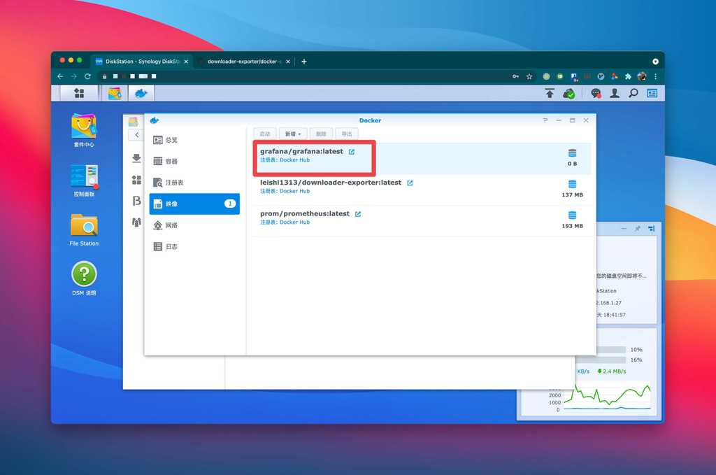 同样的,在群晖Docker的映像页面,选择新增一个映像,URL输入https://hub.docker.com/r/prom/prometheus,现在你的映像这一栏应该至少有2个映像