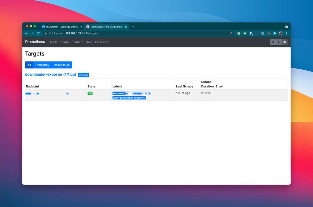 别忘了在端口设置同样把9090映射出来,然后浏览器去到群晖IP:9090,看到如下页面并且状态是UP就算成功