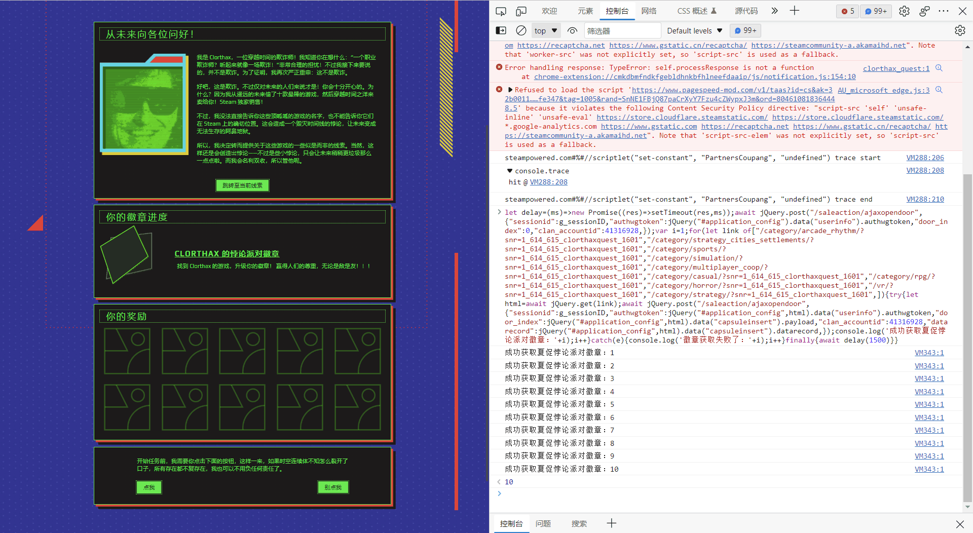 let delay=(ms)=>new Promise((res)=>setTimeout(res,ms));await jQuery.post("/saleaction/ajaxopendoor",{"sessionid":g_sessionID,"authwgtoken":jQuery("#application_config").data("userinfo").authwgtoken,"door_index":0,"clan_accountid":41316928,});var i=1;for(let link of["/category/arcade_rhythm/?snr=1_614_615_clorthaxquest_1601","/category/strategy_cities_settlements/?snr=1_614_615_clorthaxquest_1601","/category/sports/?snr=1_614_615_clorthaxquest_1601","/category/simulation/?snr=1_614_615_clorthaxquest_1601","/category/multiplayer_coop/?snr=1_614_615_clorthaxquest_1601","/category/casual/?snr=1_614_615_clorthaxquest_1601","/category/rpg/?snr=1_614_615_clorthaxquest_1601","/category/horror/?snr=1_614_615_clorthaxquest_1601","/vr/?snr=1_614_615_clorthaxquest_1601","/category/strategy/?snr=1_614_615_clorthaxquest_1601",]){try{let html=await jQuery.get(link);await jQuery.post("/saleaction/ajaxopendoor",{"sessionid":g_sessionID,"authwgtoken":jQuery("#application_config",html).data("userinfo").authwgtoken,"door_index":jQuery("#application_config",html).data("capsuleinsert").payload,"clan_accountid":41316928,"datarecord":jQuery("#application_config",html).data("capsuleinsert").datarecord,});console.log('成功获取夏促悖论派对徽章:'+i);i++}catch(e){console.log('徽章获取失败了:'+i);i++}finally{await delay(1500)}} |